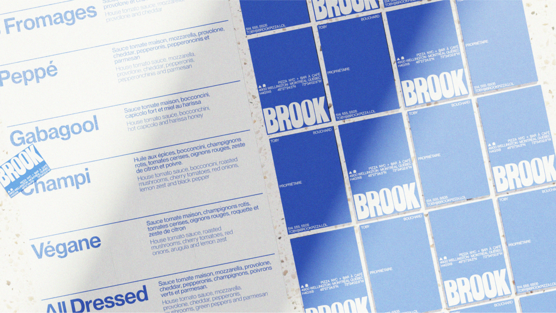 Brook is a Montreal-based pizzeria and café with a focus on the New York style slice. The project was initiated by Toby Bouchard, a master brewer who found himself liking the detour he took of fermenting dough shortly after setting up his own first brewery. Brook aims to become a staple in the neighborhood by serving food made from high quality ingredients.