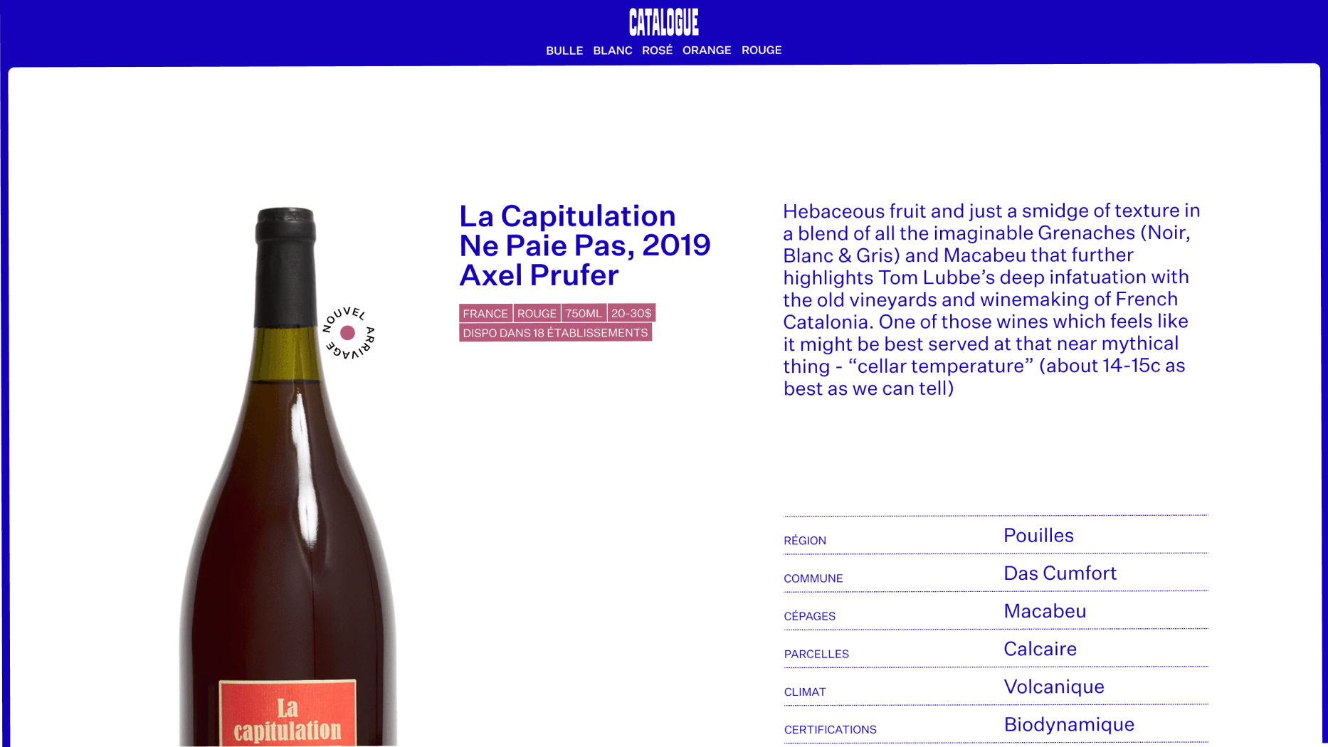 Catalogue is a platform aiming to connect people to the best wine. Due to archaic laws, in Québec, wine and spirits are mostly sold through the government operated corporation and it was previously illegal for establishments to sell them directly to consumers without a meal.